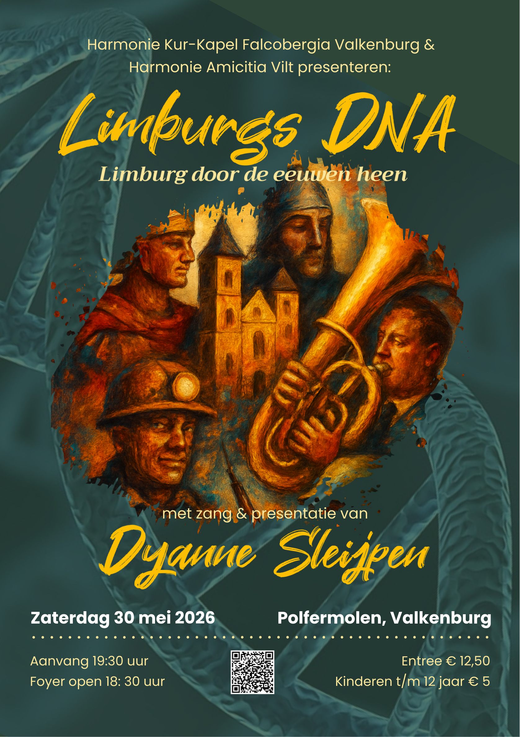 Zaterdag 30 mei 2026 Concert Limburgs DNA Limburg door de eeuwen heen. Harmonie Kur-kapel Falcobergia Foyer open 18:30 | Zaal open 19:00 | Aanvang concert 19:30 Kaartverkoop vanaf 15 april 2026 via de websites van beide verenigingen, Klik op onderstaande knop om meer info en Entreekaart verkoop.