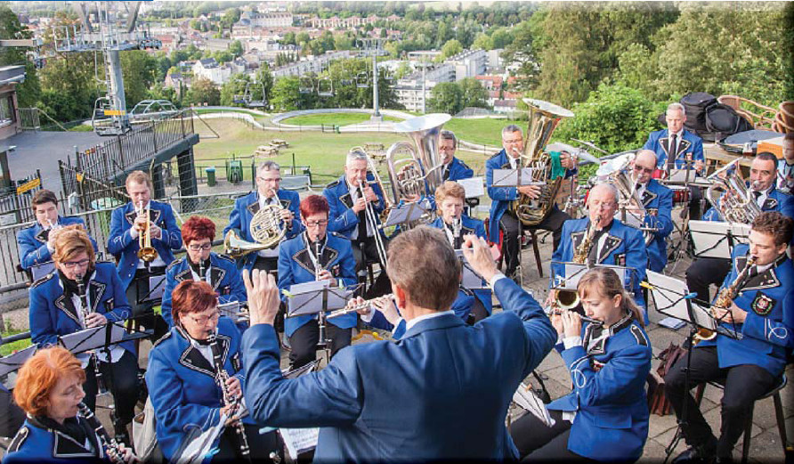 In juli houden we ook weer een tweetal ‘buiten’ repetities op speciale locaties. De eerste is op dinsdag 5 juli op het terras van de Wilhelminatoren. Het was al enkele dagen regenachig maar toen we met zijn allen in de kabelbaan plaatsnamen zag het er goed uit. Het concert begon met de drumband die twee nieuwe jeugdleden voorstelde: Dylan en Damon.